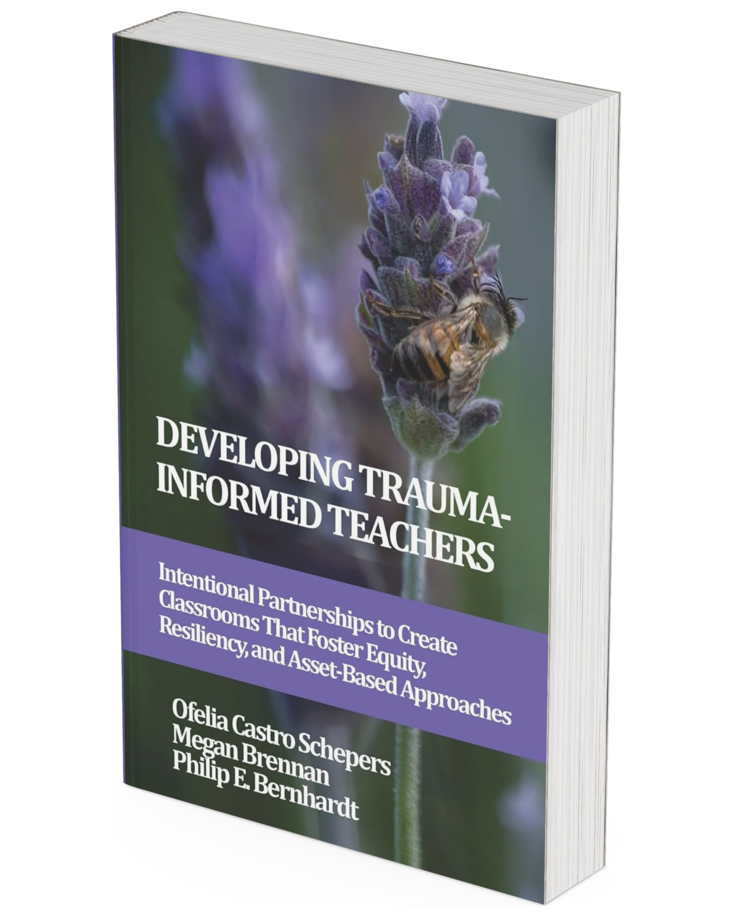 3D-rendered book cover titled 'Developing Trauma-Informed Teachers: Creating Classrooms that Foster Equity, Resiliency, and Asset-Based Approaches.' Authors listed include Ofelia Castro Schepers, Philip Bernhardt, and Megan Brennan.